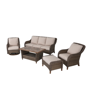 Ready to have an intimate roundtable gathering? Come and find TENAYA 5-pice wicker fire pit sofa set! Radium design realizes the dream of zero-distance experience through social activities. Once prepare for a private party, don’t hesitate to have one and steal the spotlights.