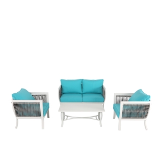 A perfect area for you to have good memory. White aluminum frame with light Blue wicker and blue cushions depict a scene of broad sea and wide sky, which brings you back to nature. Whenever you are, the expected life is always around once you sit in Lamia sofa set.